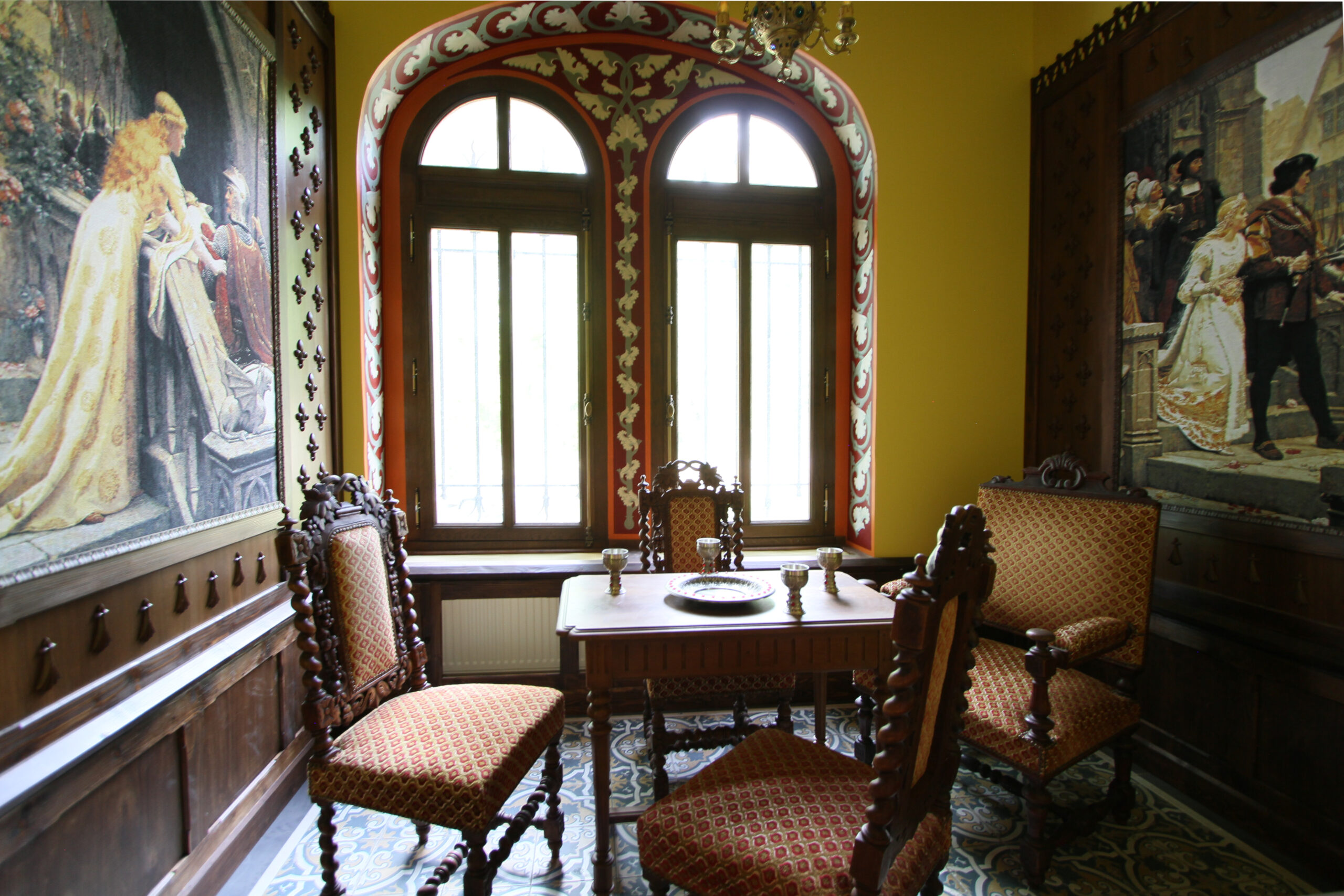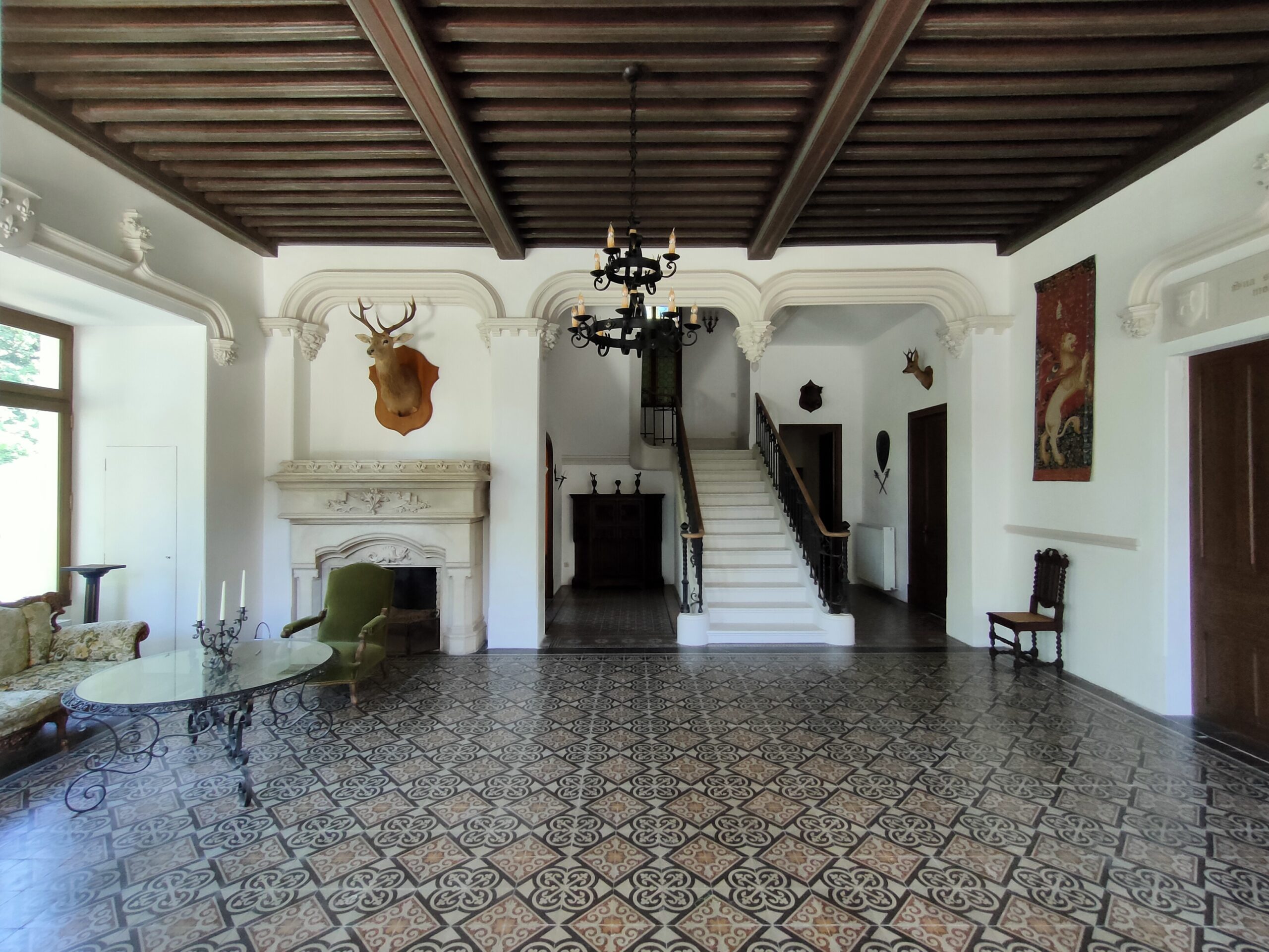 Au rez-de-chaussée du château, il y a 2 salons, 30 m² et 20 m², et grand hall de 80 m².